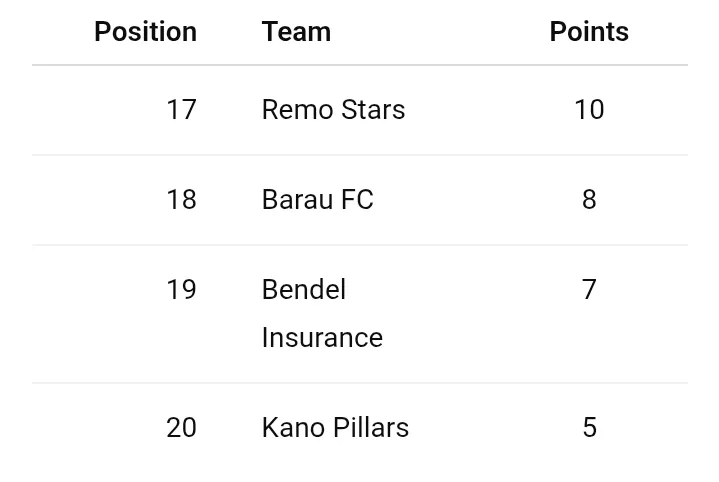 The result piled more pressure on interim manager Baba Ganaru, as Pillars remain at the bottom with just 5 points, while Niger Tornadoes climbed to 3rd with 17 points, maintaining a four-game unbeaten streak.