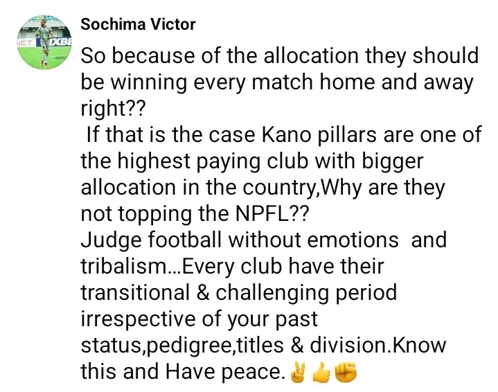 So because of the allocation, they should be winning every match home and away, right? If that is the case, Kano Pillars are one of the highest-paying clubs with the biggest allocation in the country. Why are they not topping the NPFL?? Judge football without emotions and tribalism…